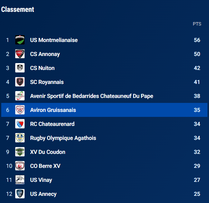 Après 15 journées, le championnat reste extrêmement dense. Gruissan pointe actuellement à la 6e place, dans un peloton où plusieurs équipes se tiennent en quelques points. La défaite concédée à Nuits-Saint-Georges (29-11) a freiné la dynamique, mais elle n’a pas remis en cause le travail entrepris depuis le début de saison.