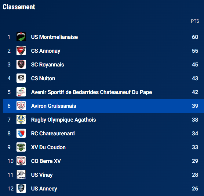 • XV du Coudon : 9e – 33 pts